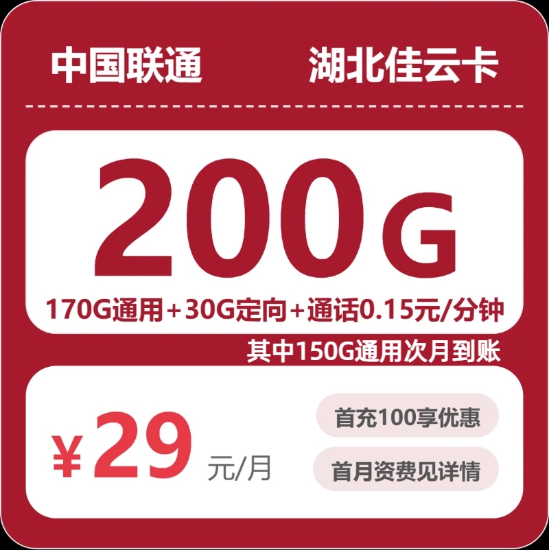 湖北佳云卡29元包200G+0.15元/分钟