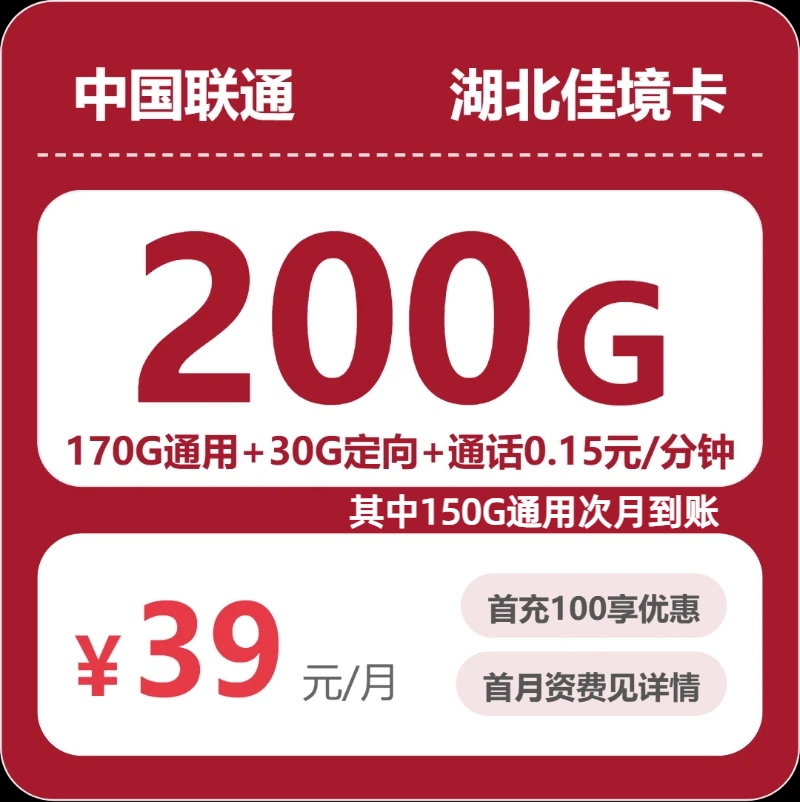 湖北佳境卡39元包200G+0.15元/分钟