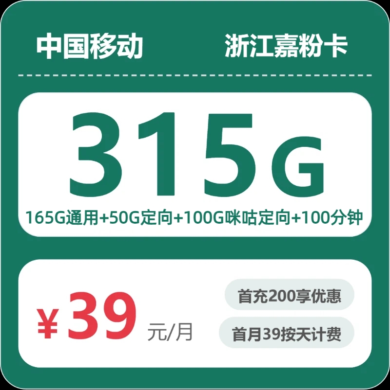 浙江嘉粉卡39元包315G+100分钟