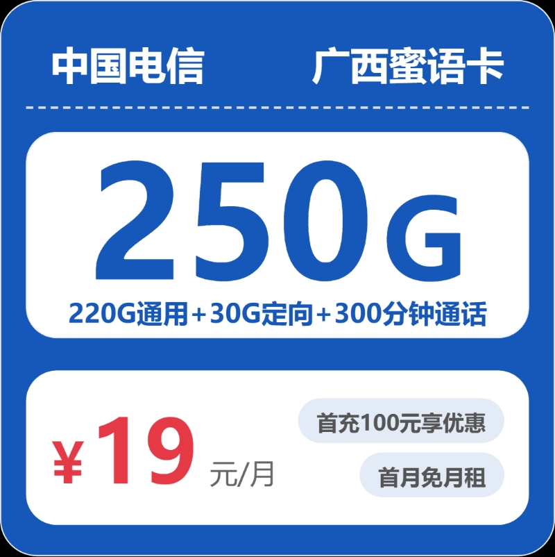 广西蜜语卡19元包250G+300分钟