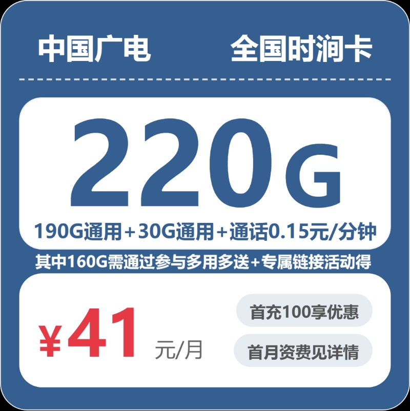 全国石涧卡41元包220G+0.15元/分钟